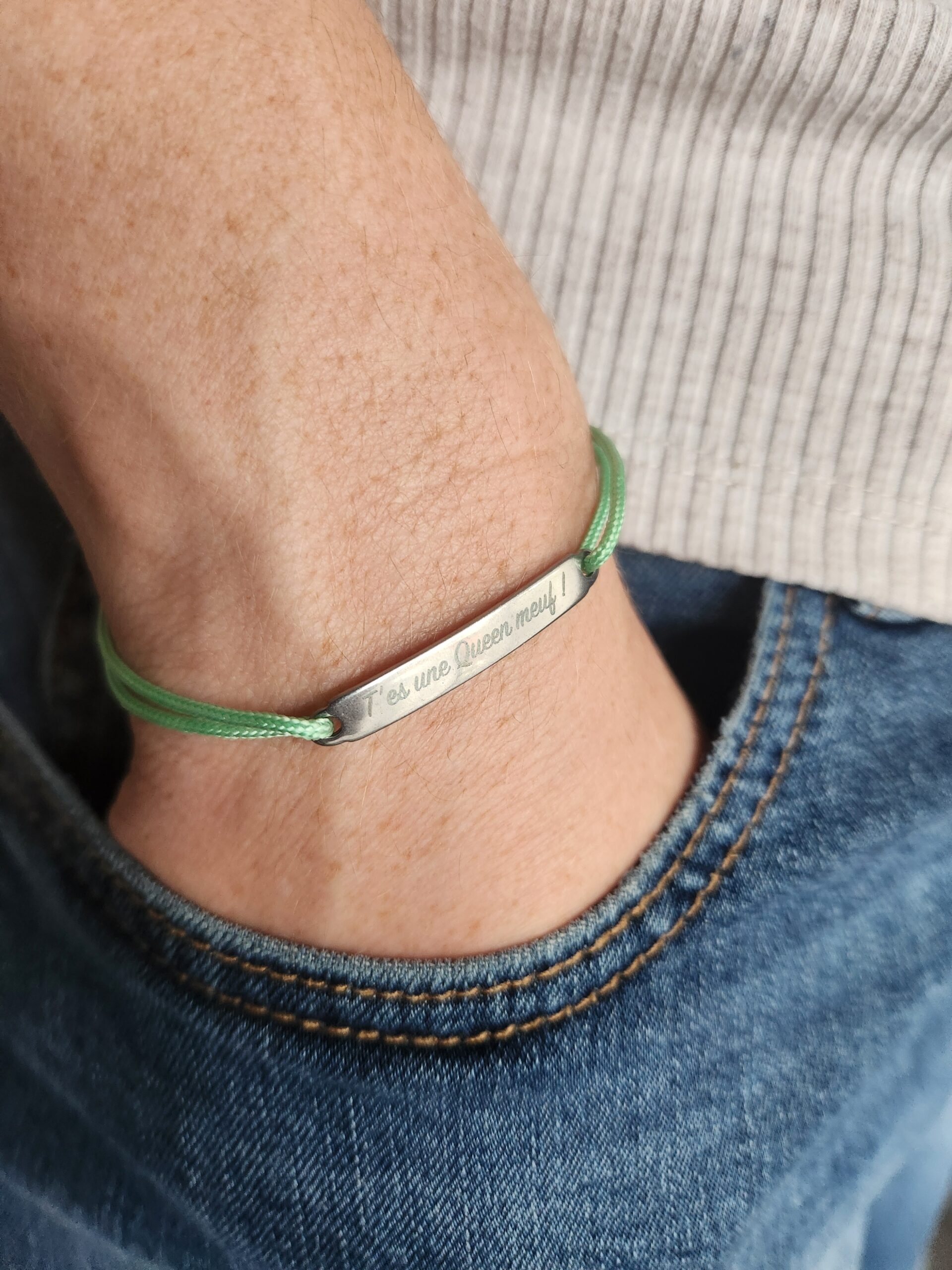 Bracelet « T’es une Queen meuf ! » en acier inoxydable, couleur du cordon vert herbe